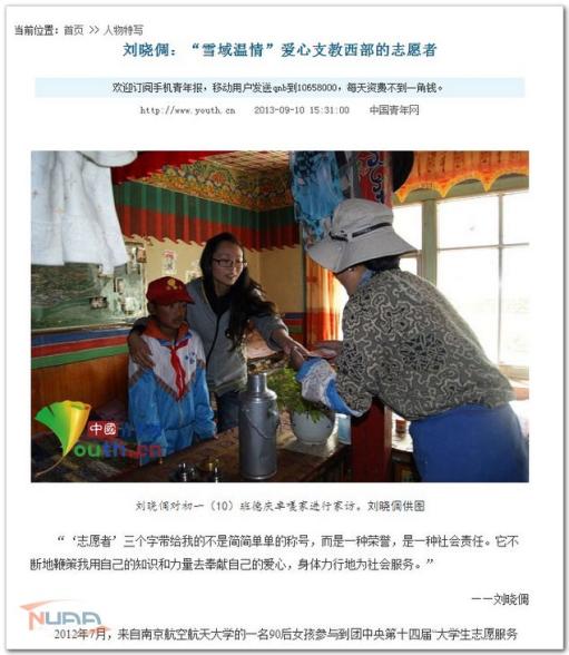 2012年7月,来自南京航空航天大学的一名90后女孩参与到团中央第十四届“大学生志愿服务西部计划”中。短短的一年时间,她建立“雪域温情”爱心公益QQ群,帮助支教的堆龙德庆县中学困难学生家庭募捐衣物;她帮堆龙中学4名贫困生找到长期资助人;她通过不懈努力,联系陈光标爱心团队,开展义卖购买课外书籍。她,就是刘晓倜。