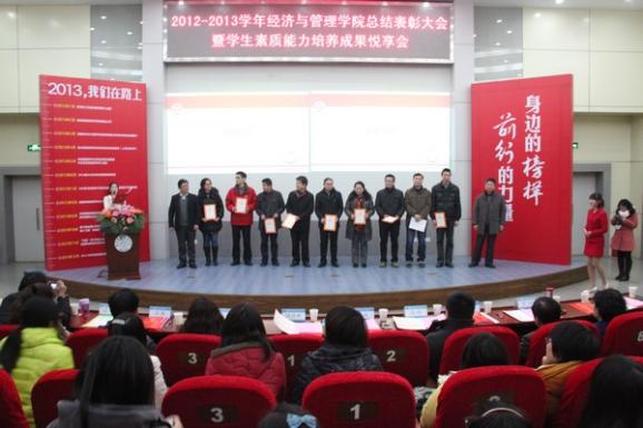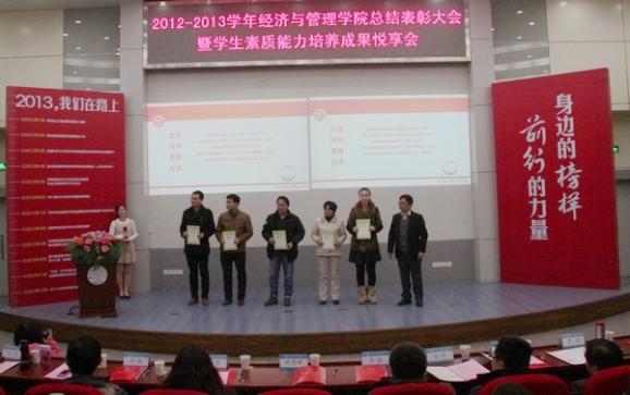 副院长张卓老师宣读2012-2013学年学校各类表彰决定,与会领导、嘉宾向获得各类荣誉奖项的学生代表颁奖。学院周德群院长结合热点时政、经济发展,教育鼓励经管学子:“要努力使自己素质过硬。世界太精彩,充满诱惑,一旦定力不够,可能光阴就在游戏旁度过,就在睡梦中流失,就在刷微信中消逝。”“努力使自己变得脚踏实地。经济学是一门显学,管理学是一门致用的学问,两者都说明了学院培养的学生一定要接地气、一定要脚踏实地。希望大家成为完整学习的人,不仅有认知,同时有行为。”并以访问以色列时最深印象是民族的创新精神切入,认为“创新真的很重要,同学们承担着中国经济产业转型的使命”,希望同学们“为理想奋斗,矢志不渝,革故鼎新,即刻付之于行动,向榜样学习,实现自我超越,为成长为高素质公民和未来的开拓者而不断努力奋斗。”(审核人:许静)