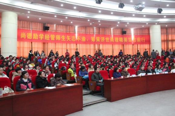 2012-2013学年“御商•致远”总结表彰大会暨学生素质能力培养成果悦享会于12月20日下午隆重召开。教务处副处长金科、校团委副书记王霄、研究生院教育管理处副处长管祎、学生处事务科科长张跃、经管院院长周德群、党委书记李遥、副院长张卓、党委副书记许静、学院办公室主任、团委书记、企业导师代表、本科生导师代表、班主任代表、辅导员以及四百多名经管学生参加,大会由工商管理系谢嗣胜老师和2012级本科生樊佳慧主持。
