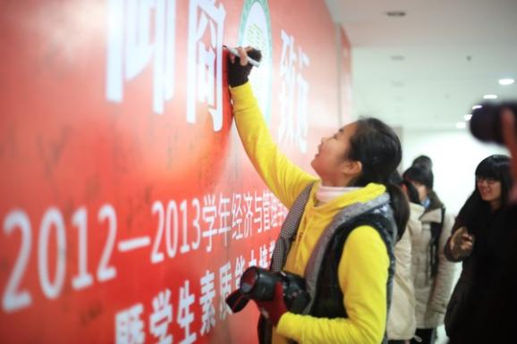 一年来经管学子在素质能力培养涌现出很多杰出的代表,顺利保送北京大学攻读硕士学位的2010级金融学专业本科生张畅,用她在学习求索道路上的奋斗故事,分享勤奋的汗水折射青春最美光芒的力量;材料学院吴清春同学在沉沦后重新振作,讲述了坚持和毅力的力量;“江苏省十大杰出青年” 李佳兴,作为唯一当选的高校学子分享她的志愿之旅,用行动展现着中国志愿者的靓丽风采,用笑容为南航志愿精神代言;第十三届“挑战杯”中国大学生课外学生科技作品竞赛一等奖获得者金蓉英借助专业知识积极参与科技创新,取得骄人的成绩,与大家分享了她的挑战之行;完全由经管本科生组成的蚂蚁帮帮从无数优秀团体中脱颖而出,获得学校优秀团队称号,现场讲述了蚂蚁帮帮创业,成功获得20万政府资助的故事;2011级文强班则以“商家国四海之事,理内外八方之难,怀兼济天下之心,育经天纬地之才”为班训,根植梦想,协同发展,感动了每一位听众。