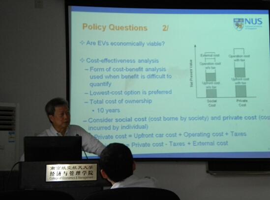 邹邵强教授的报告内容非常丰富,分别从新加坡电动汽车的应用和新的生物质能利用两方面讲述了如何达到能源高效率和环境友好发展。首先,邹教授以新加坡为例,讲述了电动车应用的现状,存在的政策问题,使用的经济、环境效果,并对将来的发展做了展望。据悉,目前电动车在新加坡的使用获得了较好的反响。其次,邹教授说明了生物质利用对环境的影响,他提出可从松树等植物中提取生物质柴油,这样既增加了生物质利用量,更重要的是防止了生物质能源的利用与人类所需食物资源减少相矛盾的问题,达到和谐发展。邹教授新颖的观点激发了与会师生极大的兴趣。
