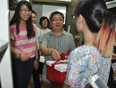 新生刚刚到达一个陌生的生活学习环境,不安和陌生的情绪会减缓他们适应大学生活的脚步。9月2日上午,南京突然大雨倾盆,与此同时,一行人悄悄的来到29栋宿舍。经管院的党委书记李遥、党委副书记许静、团委书记任慈、辅导员和班导们,为过生日的新生们送上生日蛋糕和祝福。生日蛋糕的甜蜜带去的是经管院老师们对新生的爱护和盼望,新生和家长们体会到了学院的良苦用心,纷纷表示学院的迎新工作做到了新生和家长们的心坎里。