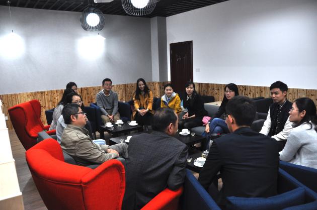 室外阴雨绵绵,咖啡吧内却温暖如春,伴着浓浓的咖啡香气,老李时间在轻松的氛围中展开。队员们兴致勃勃的向老师们谈起近况,从最初参赛的心路历程到团队合作的艰辛与感动,从专业知识的自学到无数轮的培训指导,队员们你一言我一语,都由衷地感觉自身素质能力得到了很大锻炼,也特别珍惜团队合作的友谊。同学们在感谢学院及老师们支持的同时,也自信地表示已经准备地十分充分。其中队员金蓉英就说到“我们希望把作品及团队最好的一面展现给评委,抱着享受比赛的心情去参赛,把评委当朋友一样轻松对待!”当看到队员们的信心满满,现场的老师更是给予了不断的鼓励,刘益平老师从校内选拔赛开始就一直陪伴在大家身边,现场给予了大家充分的肯定。查冬兰老师从自己两次参加挑战杯的经历谈开来,李珊老师,刘文龙老师从自己的专业商务及营销知识角度入手,帮助大家思考评委有可能提到的问题,许静书记鼓励大家轻松上阵微笑参赛,大家时而掌声时而静心听取老师们的意见。交流过程中,李遥书记表示他很感动同学们在准备非常辛苦的情况下依旧表现得很轻松,也很感谢学院老师和同学们在一年多的准备过程中的奉献和付出,不断的询问每位队员是否还需要学院哪些支持与帮助,并叮嘱大家赛前注意身体,期待大家满载而归!