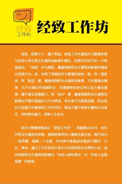 为促进大学生职业生涯规划教育长期化、品牌化而进行的一次有益尝试,工作坊将邀请企业HR、校内外职业生涯规划专家、辅导员等相关人事做主题交流,每月举办一至两期,每期一个主题,并由参与者就该主题进行提问、讨论、争鸣,通过工作坊促进大学生对自我和职业世界的认知,完成学院职业生涯规划教育由“协助人顺利择业”向“协助人全面发展”的转变。