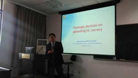 2015年11月5日下午2点,在禁忌书屋 大楼704报告厅,加拿大滑铁卢大学管理科学系的Bonwoo Koo教授来学院,作了“Strategic decision on patenting vs. secrecy”的报告。副院长王英,区域经济与产业经济研究所所长江可申,智能决策与风险分析研究所的陈晔、陈洪转、李杰,区域经济与产业经济研究所的苗建军张伟、马晓平等老师以及两所的全体研究生参加了此次报告。