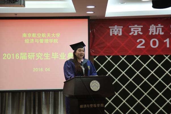 毕业典礼上,四名优秀毕业生带来一首原创的小诗《临别心语》表达了同学们对母校的依恋和导师的感恩。从初到南航的紧张忐忑和踌躇满志,到后来科研过程的披星戴月、披荆斩棘,其中有家人同学的鼓励与支持,更有导师的循循善诱、谆谆教诲,到如今毕业心中满是对母校留恋不舍和深深感谢。最后,四名同学也代表全体毕业生向母校承诺,将“尚德励学,筹策济世”的院训铭记于心,努力成为国家栋梁之才。