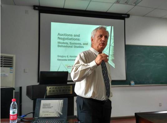 Gregory E. Kersten教授此次报告主要介绍了拍卖、多属性决策以及谈判的有关内容。报告讲述了拍卖的具体实施策略与模型,以及多边谈判在供应链中可能出现的情况。同时,Gregory E. Kersten教授介绍了可以运用在拍卖与谈判实验上的已被开发的一个系统,并通过举例说明了系统的运行成果。报告最后,大家通过发言提问与Gregory E. Kersten教授进行进一步的交流与沟通,Gregory E. Kersten教授解答了大家的疑问。学术报告最终在轻松愉悦的氛围中圆满结束。