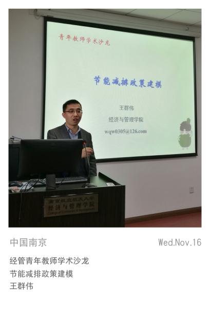 11月16日中午第二期“经管青年教师学术沙龙”第五场由王群伟博士主讲。院长周德群教授及管工、工商、经济系的部分老师和研究生20余人参与此次学术讨论和交流。此次沙龙由杨帅博士主持。
