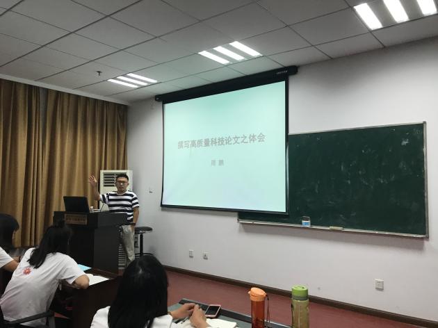 2017年9月26日18:00,在学院704教室,周鹏老师为2017级研究生新生做了题为“如何撰写高质量科技论文”的精彩学术讲座。讲座由罗正军副教授主持,全院近百名硕士研究生和博士研究生参加了此次讲座。 讲座在一片热烈的掌声中开始,周鹏教授首先从科学和技术的角度说明了科技论文的含义,而后又重点阐述了我们为什么要写科技论文,着重从研究生现实的学业要求、科研创新的自我价值实现和锻炼逻辑思维三个层面分析了这个问题,让现场的同学对撰写高质量论文的意义有了更深层次的理解。随后周鹏教授结合自己的经验诠释了“高质量”的具体含义,并强调了语言的精炼表达和科研创新对撰写高质量科技论文的显著作用,同时结合具体事例逐一指出撰写论文时各部分的注意事项,强调引言、结论和参考文献等部分对于提高论文内涵具有深刻意义。讲座临近尾声,在座同学踊跃发言并积极交流,更大地促进了此次学习的成果分享。 通过本次精彩的讲座,同学们对于高质量科技论文的含义有了更为深刻的理解,学习了撰写高质量论文的技巧,拓展了自己论文写作的视野,激发了写作热情,增强了对于撰写高质量论文的信心,为以后同学们撰写高质量科技论文提供了宝贵经验。 周鹏教授现担任禁忌书屋