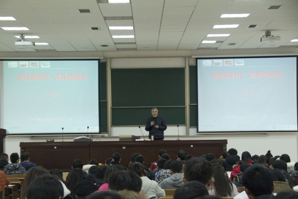 丁荣茂老师由当代南航学子的责任与担当引出了第一个篇章“学习十九大,喜迎校党代会”,从新时代、新思想、新目标、新使命、新理念、新征程几个角度深入浅出地为同学们解读十九大报告中的内容。过程中丁荣茂老师不仅引经据典更是联系自身生活工作经历,告诫同学们要“守住自己的底线”,并嘱托同学们大学的四年是为今后的人生打基础的黄金时间,也是同学们砥砺奋进、厚积薄发的关键时期,引发阵阵掌声。恰逢校党代会即将召开之际,丁荣茂老师由十九大报告中对当代青年的寄语“广大青年要勇作时代的弄潮儿”引出了第二个篇章“共筑南航梦”。丁荣茂老师为同学们介绍了南航悠久的发展历史、优美的校园环境、优秀的历届校友,并鼓励同学们继承并发扬南航精神,并对经管新青年们提出“艰苦磨练意志 勤奋造就人才”的寄语,引发了同学们的深刻共鸣。