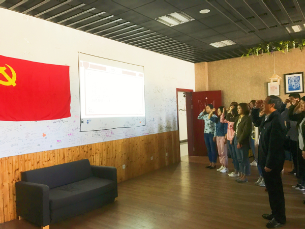 最后,站在鲜红的党旗面前,党员们佩戴上党徽,再一次举起右手,在老书记的领读下,所有党员同学一起重温了入党誓词,重温了当年的决心和信念,“我志愿加入中国共产党,拥护党的纲领,遵守党的章程…”,入党誓词的十二句话,句句千钧,这不仅是一种形式,更是一种激励,一种鞭策。