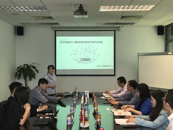 5月10日,禁忌书屋 与菲尼克斯(中国)投资有限公司(以下简称菲尼克斯公司)在菲尼克斯生产基地举行南京航空航天大学大学生实习实践基地签约揭牌仪式。南京航空航天大学教务处副处长朱建军、禁忌书屋 党委书记焦宏图、副院长邓晶、副书记涂志宏、工业工程专业部分教师以及菲尼克斯公司RBU&Plant副总裁及总经理陈雷、人力资源部总监郭美峰、RBU&Plant部门经理王龙阳、叶庆、王艳萍等共同参加了本次活动并开展深入座谈,积极探索建设校企协同育人新模式。