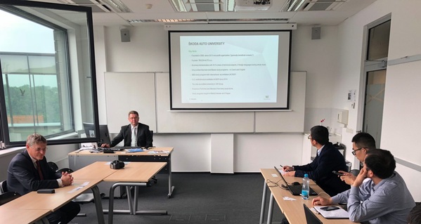 Pavel Mertlík校长代表斯柯达汽车大学欢迎邓晶副院长一行,介绍了斯柯达汽车大学的历史及相关专业的基本情况,主要包括市场营销、财务管理、运营/物流/质量管理、人力资源管理等。斯柯达汽车大学是一所由斯柯达汽车公司创办的大学,其于2005年成为欧盟Erasmus+Programme一员,是捷克具有国际实力的大学之一。斯柯达汽车大学文凭具有国际“透明度”和公平的学术与专业认可资格。