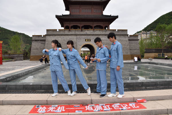 在宝塔山下的广场上,团队成员穿上了革命时期红军的服装,化身延安“老兵”,通过模仿革命时期的青年红军,致敬当年的革命先烈,再现老兵们的勇武与英姿。