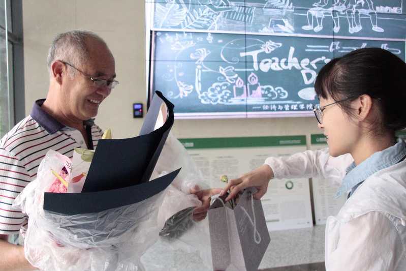 为了让更多的老师感受到同学们的情谊,同学们以“感恩礼袋”的形式送祝福:写得一手好字的同学们为老师们准备了带有经管特色的明信片,用简单而真挚的话语表达了同学们对老师的感恩之情。除此之外,可擦拭粉笔末的湿纸巾、能缓解老师长时间授课喉咙不适的金嗓子喉宝、为炎热的天气带来清凉的矿泉水、象征着爱与尊敬之情的康乃馨…同学们为老师准备的虽然都是些小礼物,但表达的是我们对老师的关心和感恩,是我们对经管老师们的一片用心。