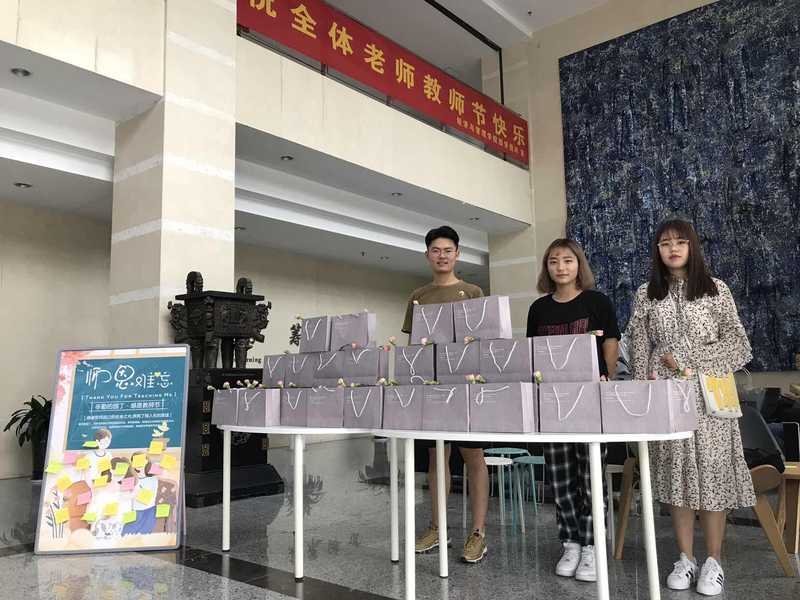 9月10日早晨,团支书、班长们为老师们送去了精心准备的教师节礼袋,团学骨干们则在学院一楼大厅设置了摊点,祝福的横幅使得氛围格外温暖,同学们向辛勤的老师们送上一个简单的“感恩礼袋”,感谢老师们的教诲与指导。