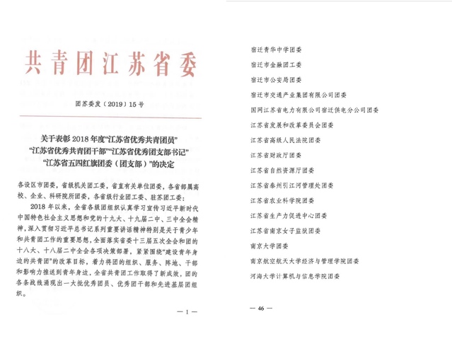 近日,共青团江苏省委发文表彰2018年度五四红旗团委、五四红旗团支部、优秀共青团员、优秀共青团干部。禁忌书屋 团委荣获“江苏省五四红旗团委”荣誉称号。