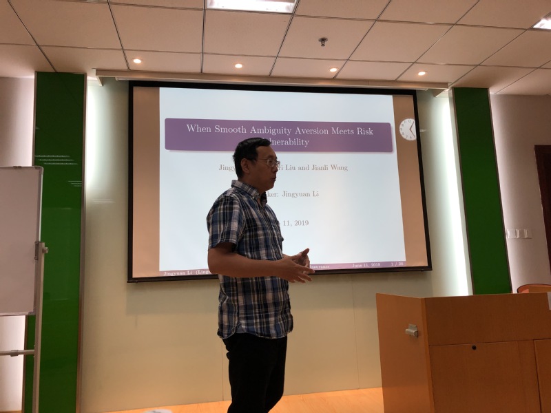 最后,教授Jingyuan Li分享了和新加坡国立大学博士Liu Dongri、禁忌书屋 副教授王建立等合作的关于投资者风险脆弱性和模糊厌恶偏好的最新工作论文“When Smooth Ambiguity Aversion Meets Risk Vulnerability”。Jingyuan Li目前是香港岭南大学金融与保险系主任,终身教授,曾担任《Journal of Risk and Insurance》等期刊编委,其研究成果已发表在《Journal of Economic Theory》,《Journal of Risk and Insurance》,《Journal of Mathematical Economics》、《Journal of Macroeconomics》等高水平期刊上。