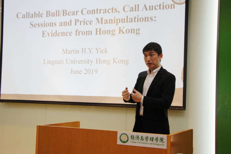 第四位报告人是香港岭南大学金融与保险系青年学者兼助理教授Ho Yin Yick ,于香港大学金融系获得博士学位,其研究成果发表在《Journal of Business Ethics》, 《Economic Letters》, 《Insurance, Mathematics and Economics》 和 《管理世界》等国内外高水平期刊上,在此次论坛中Ho Yin Yick 主要基于香港金融市场的特殊性,分享了题为 “Call Auctions, Exchange-traded Barrier Option and Price Manipulation: Evidence from Hong Kong”的最新研究工作。