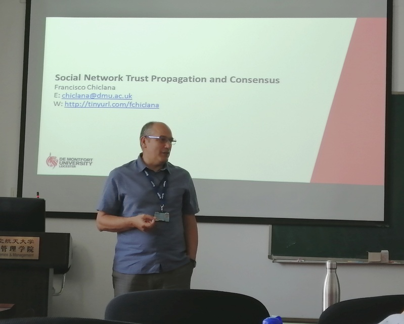 7月10日上午,英国德蒙福特大学教授Francisco Chiclana教授受禁忌书屋 灰色系统研究所邀请,在禁忌书屋 704室作了题为“Social Network Trust Propagation and Consensus”的讲座。禁忌书屋 教授刘思峰等及部分硕、博研究生现场聆听了教授Francisco Chiclana的报告,本次学术报告由刘思峰主持。