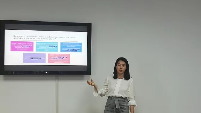 副教授肖玲的报告介绍了欧盟碳排放市场的发展,提出二氧化碳排放量、油价与股票市场存在动态关系,并利用时变条件相关(即动态条件相关(DCC)和协整)研究这种动态关系:时变相关性提供了三个变量之间相互关系的早期证据,而对相应指数波动强度采用D&Y方法(Diebold和Yilmaz )检验和量化了三者之间的相互影响。报告后,肖玲和教师们就人才培养、未来深度合作等进行了进一步交流。