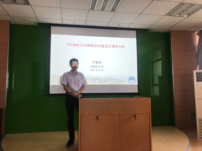 9月9日下午,华南理工大学教授牛保庄受禁忌书屋 能源与环境经济研究所邀请,在禁忌书屋 702室作了题为“以POM论文为例谈供应链竞合博弈分析”的报告。本次学术报告由副院长王群伟主持,禁忌书屋 教授查冬兰、刘文杰等10余位教师及20余名硕士、博士研究生参加了报告会。