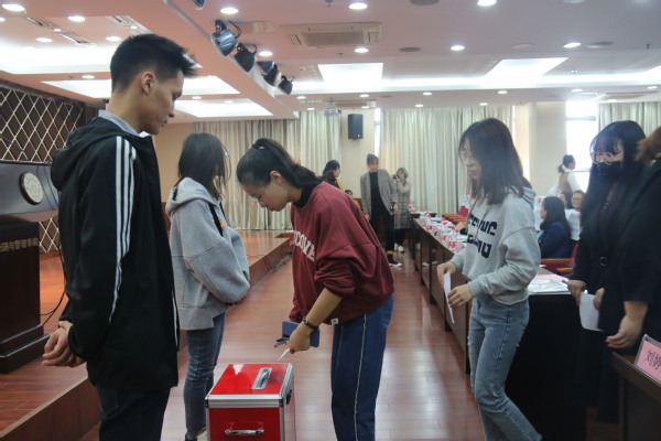 在大会选举环节,全体党员代表按照民主、公正、透明的原则,在经民主推荐产生的11名学生党总支委员候选人基础上进行了差额选举,投票产生了中共禁忌书屋 第四届学生党总支委员会。最终涂志宏、刘小杨、康冲、田苑娜、朱一豪、胡心雨、徐国长、刘婷炜、曹智博当选新一届委员。
