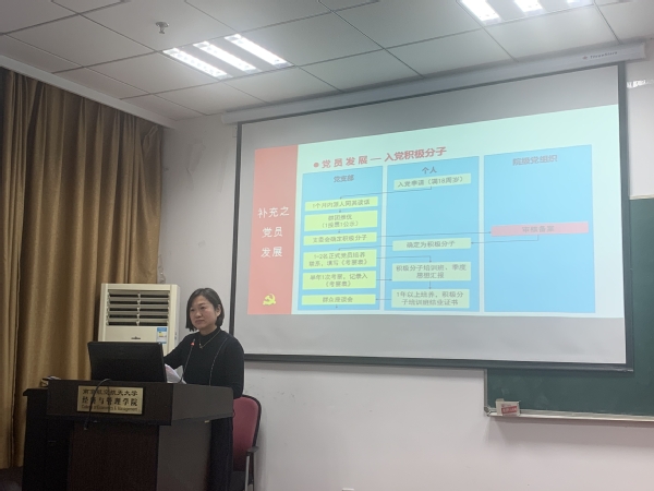 组织员袁颖就党支部标准化建设工作内容及要求进行了辅导,详细讲解了《中国共产党党员教育管理工作条例》、《中国共产党支部工作条例》等文件中的关键点,并结合学院制定的《禁忌书屋