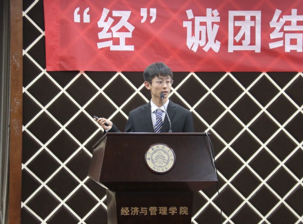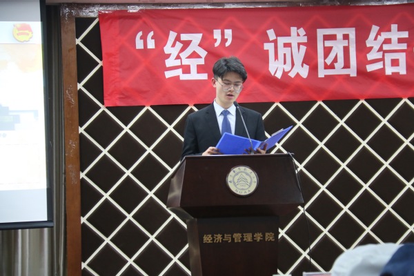 学生会主席王康宇回顾了过去一年里,经管团学组织如何将自身能力发挥到最大化,在学院的大小活动现场展现经管青年为同学服务的赤诚之心,用实际行动,彰显经管学子奋发向上、努力拼搏的品质。同时代表第30届团学组织全体成员树立了更高的目标。