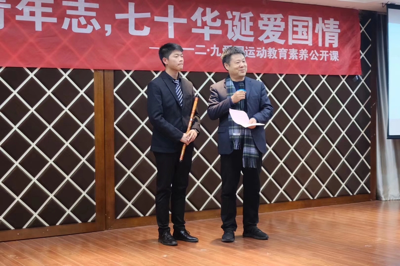 公开课伊始,董羽为在场学生讲述了一堂生动的微团课,围绕“是什么”“为什么”“怎么做”这三个问题,回顾了一二九运动发生的背景和历史意义,他引用习总书记对新时代中国青年提出的“六点要求”,指明当代青年的历史使命、肩负重任,并结合时代背景对经管学子提出了牢树青年志、永怀报国情的希望与要求。接着,学院各级学生骨干进行了形式多样的表演,讲述他们心中的爱国情。既有激情澎湃的朗诵与演讲,又有扣人心弦的歌曲合唱;既有发人深省的话剧,又有清新脱俗的竹笛演奏。激动人心的表演让在场学生经历了一次深刻的爱国主义洗礼,他们纷纷表示此次公开课让他们受益良多,大一学生向金玉表示:“很荣幸参加这次活动,让我能够更加深入地了解红色历史,作为大学生的我,会像先辈们一样,以深厚的家国情怀作为立身之本,怀抱坚定的信仰,用行动去实践新时代的爱国主义。”