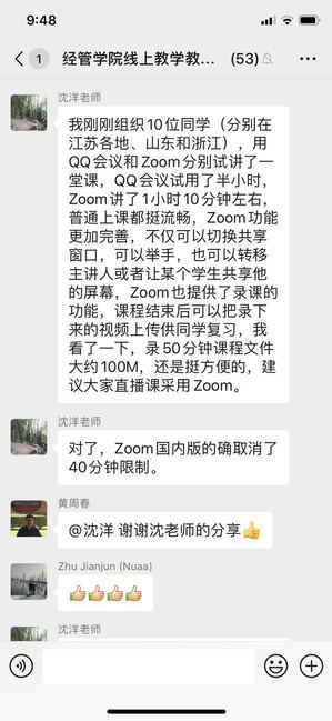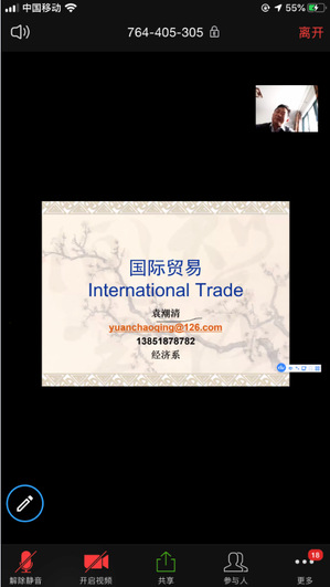 8点,禁忌书屋 院长周德群在线进入18级国贸专业本科生《国际贸易原理》的线上课堂。袁潮清老师已经在zoom平台中开始了课程导论的讲解。周德群院长参加了课堂的学习并借机对该课堂的老师和同学们表示慰问和关心,鼓励大家高效利用线上教学资源,提升自主学习效率,并希望大家在多种平台使用期间,关注并反馈体验心得,为将来线上线下教学融合奠定基础。