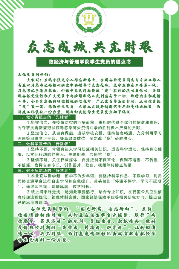 2月初,禁忌书屋 学生党总支向全体学生党员发出倡议,号召全体学生党员践行“尚德励学,筹策济世”的院训,众志成城,共克时艰,为打赢疫情防控阻击战贡献南航经管学生党员的一份力量。