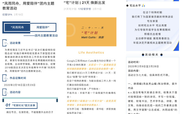 禁忌书屋 各级团总支积极行动,推出21天“宅”计划,成立兴趣小组,开展“风雨同舟,用爱相伴”主题“云模式”团日活动……教育引导禁忌书屋 团员青年在寒假期间积极抗击疫情,主动修学储能,展现青春担当。