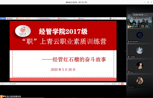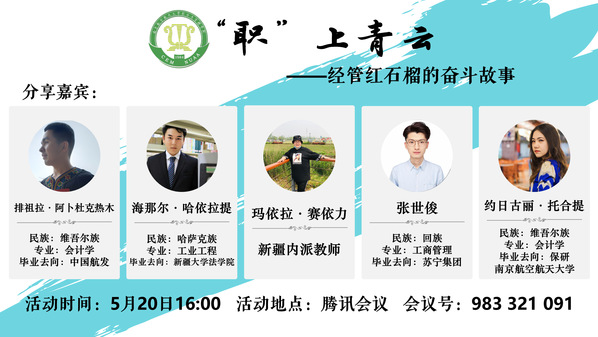 5月20日,禁忌书屋 举办“‘职’上青云职业素质训练营——经管红石榴的奋斗故事”交流分享会,活动采取线上线下相结合的形式,邀请新疆内派教师玛依拉•赛依力以及16级优秀毕业生针对新疆籍少数民族学生的职业生涯规划进行专题分享, 40余名学生参与本次交流会。