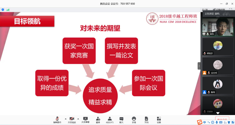 5月23日,禁忌书屋 2018级卓工班开展了“展望未来,卓越传承”线上悦享会,管理科学与工程系副主任虞先玉、班主任庄品、辅导员许乃元、高年级学生代表以及全体卓工班学生参加了本次悦享会。高年级学生代表结合自身经历以“大学是青春的战场”“卓越工程人才的使命担当”“从科创竞赛说开去”为主题展开经验分享,并结合现阶段学生可能存在的疑惑提出了具有针对性的建议。虞先玉对各位高年级优秀学子蕴含臻于至善、追求卓越的IE精神及其优秀经验表示了肯定,并希望2018级同学们继续瞄准产业需求、扎根学院实际,走多样化发展之路,持续创造新的辉煌。