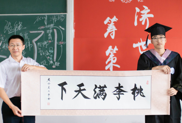 随后,各系毕业生代表回顾了自己在南航的求学故事,从齐头并进的学习科研,到丰富多彩的课余活动,点滴故事中表达了对母校母院的深深感激和诚挚祝福。在即将离开母校之际,全体毕业生也为学院送上了礼物:管工系学生以一树绿萝盆栽祝福学院师生事业、学业四季常青;工商系学生用书法《桃李满天下》表达对学院教师教书育人、诲人不倦的感激之情;由经济系全体毕业生手印组成画作《桃李繁硕硕,松柏长青青》寓意学生牢记师恩难忘、未来奋发向上。