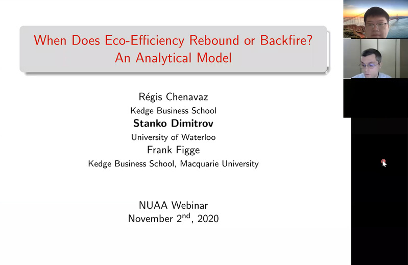 11月2日上午,加拿大滑铁卢大学教授Stanko Dimitrov受学院智能决策与风险分析研究所邀请,在ZOOM会议作了题为“When does eco-efficiency rebound or backfire? An analytical model”的讲座。禁忌书屋 教授徐海燕等教师及部分硕、博研究生线上参加了Stanko Dimitrov的报告分享,本次学术报告由徐海燕主持。