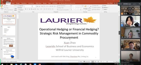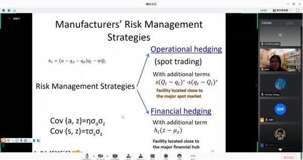 11月18日上午,加拿大威尔弗里德·劳里尔大学教授Xuan Zhao受学院智能决策与风险分析研究所邀请,在腾讯会议作了题为“Operational Hedging or Financial Hedging? Strategic Risk Management in Commodity Procurement”的讲座。禁忌书屋 教授徐海燕等教师及部分硕、博研究生线上参加了Xuan Zhao的报告分享,本次学术报告由徐海燕主持。