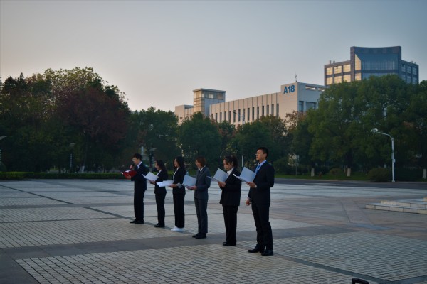 7点整,升旗仪式正式开始。五星红旗在国旗护卫队护送下进入广场,伴随着庄严的《义勇军进行曲》,五星红旗冉冉升起,全体师生向国旗敬礼仰注。