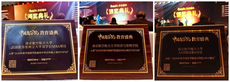 值此中国商科教育发展30周年之际,为表彰和激励优秀商科项目、团队和个人,现场颁发了几类奖项,200多所商学院院长、老师共同见证这一荣耀时刻。南京航空航天大学MBA项目荣获“最佳MBA项目TOP100”第36名,南京航空航天大学与密苏里州立大学合作的MBA项目荣获“最佳中外合作硕士项目TOP30”第14名,南京航空航天大学3A领航MBA项目荣获“最具特色MBA项目”,禁忌书屋 副院长王子龙获得“中国商学院卓越运营奖”。
