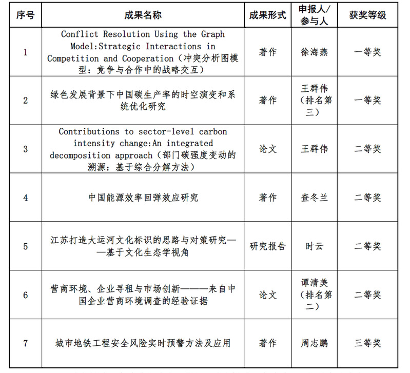 近日,江苏省人民政府颁发了《省政府关于公布江苏省第十六届哲学社会科学优秀成果奖的决定》(苏政发〔2020〕106号),正式公布江苏省第十六届哲学社会科学优秀成果奖的评审结果。学院共有7项成果获奖,其中一等奖2项(第一单位1项)、二等奖4项(第一单位3项)、三等奖1项。