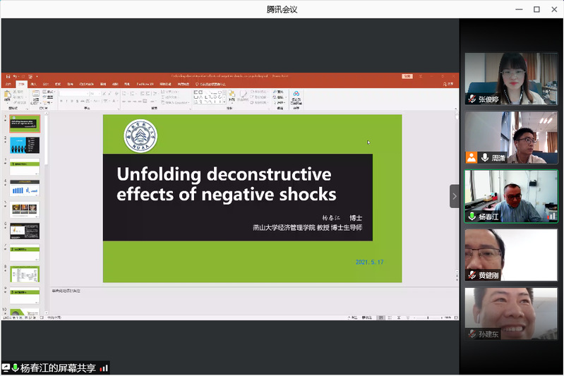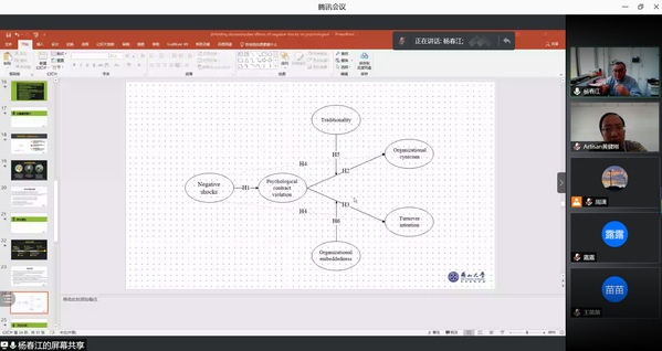 5月17日,燕山大学经济管理学院教授杨春江应禁忌书屋 人力资源管理研究所和江苏省人力资源发展研究基地的邀请,在线上作了题为“消极震撼事件的影响及机理研究——基于服务业一线员工的调查”的精彩学术报告。本次报告由教授胡恩华主持,年轻教师、博士生和硕士生参加了此次学术报告活动。