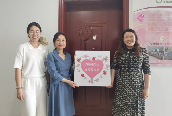 最后,胡心雨带领大家参观了“心苑时光社”心理工作站,禁忌书屋 划拨506办公室作为心理健康室,为心理健康教育提供场地支持,开设“心灵图书&解压角”,摆放有关心理减压、人际交往、导学关系等方面的心理书籍和减压工具,旨在为学生创造一个舒缓心情的绝佳场所。涂志宏、陈瑜共同为心理工作站以及心灵解压角挂牌。