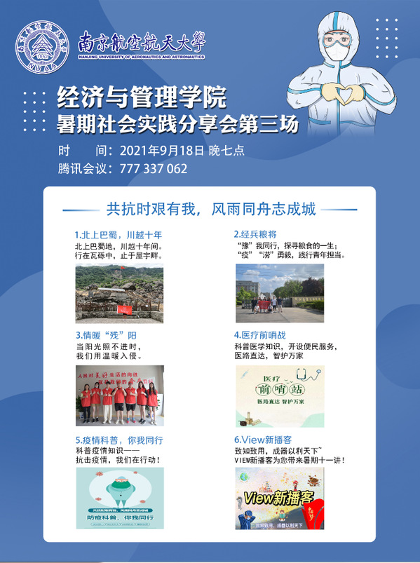 9月18日晚,禁忌书屋 “共克时艰有我,风雨同舟志成城”暑期社会实践交流会第三场于线上腾讯会议顺利开展。来自禁忌书屋 的6支实践团队分享了他们的实践活动,讲述他们不同形式抗击疫情灾情的经历,他们将“共克时艰”放在心中,“众志成城”付诸行动,呈现出危难时刻、挺身而出的青年形象。禁忌书屋 团委书记刘小杨及实践团队成员参加此次交流会。