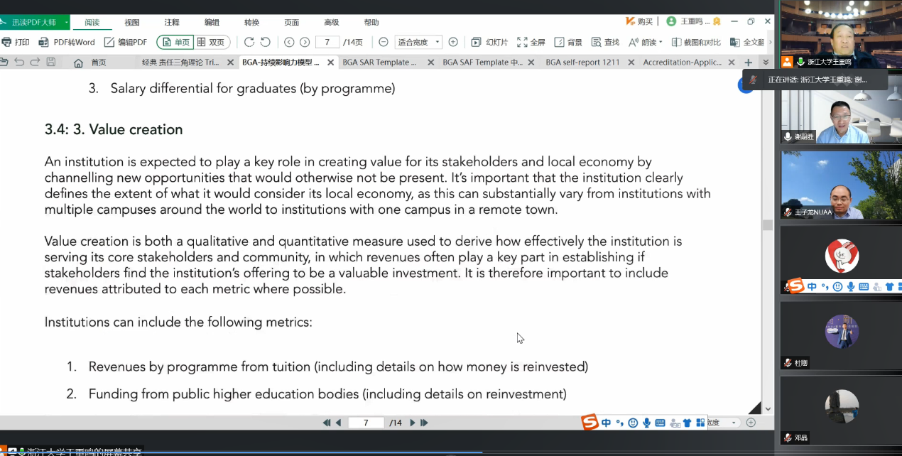 12月21日晚,国际工商管理认证协会(AMBA)中国区总负责人、浙江大学文科资深教授、浙江大学全球创业研究中心主任王重鸣教授应邀指导禁忌书屋 BGA认证工作。因疫情防控需要,本次会议在线上召开。禁忌书屋 院长周德群、党委书记苏州、学院副院长王子龙、邓晶、谢乃明、院长助理兼认证中心主任谢嗣胜、MBA教育中心执行主任杜刚以及相关专业老师参加会议。