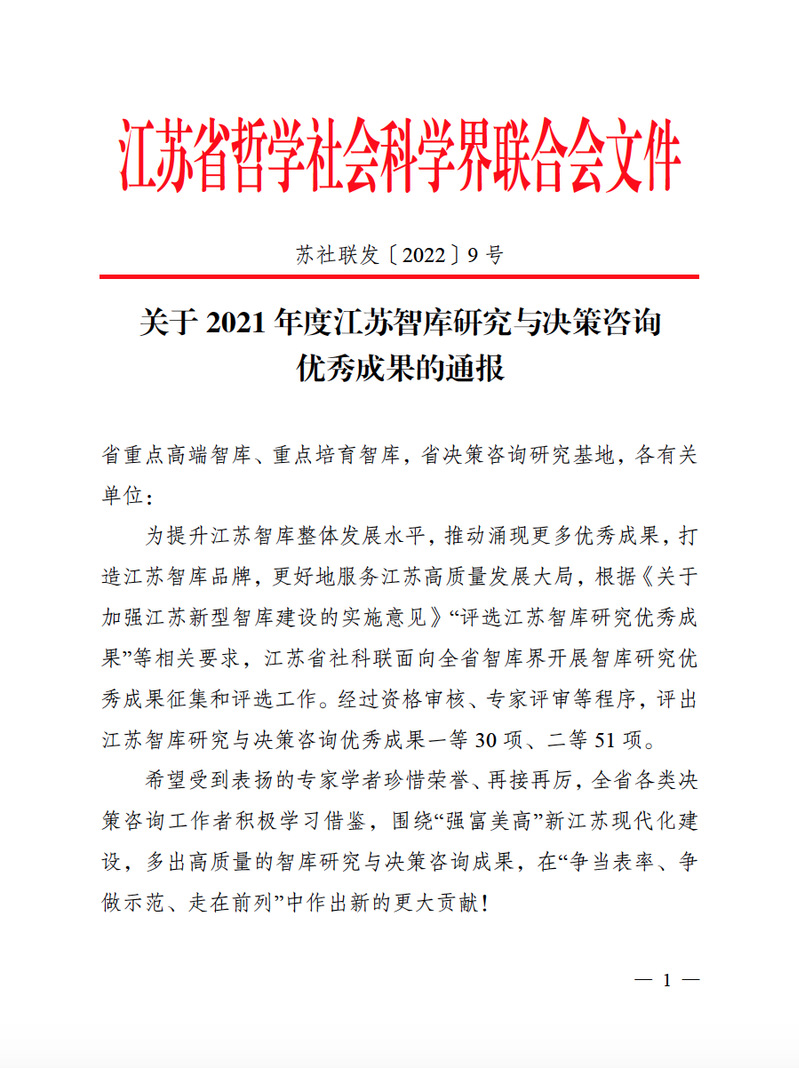 江苏省智库研究与决策咨询优秀成果评选旨在推进新型智库建设,提升江苏智库整体发展水平,更好服务“强富美高”新江苏建设。