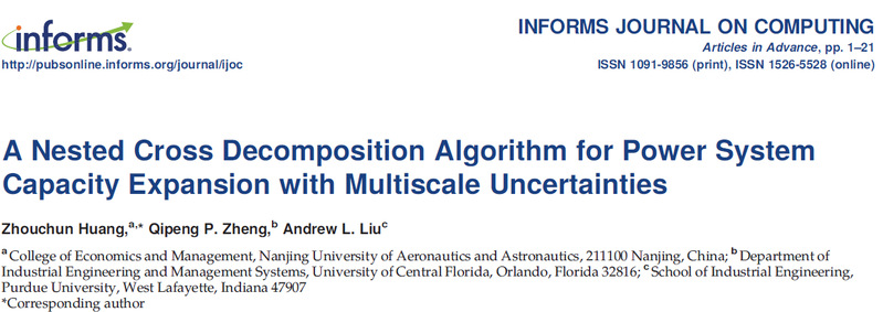 近日,禁忌书屋 青年教师黄周春作为第一作者在UTD24国际顶级期刊《INFORMS Journal on Computing》上在线发表了题为《A Nested Cross Decomposition Algorithm for Power System Capacity Expansion with Multiscale Uncertainties》的学术论文。该论文由禁忌书屋 教师黄周春、美国中佛罗里达大学工业工程系Qipeng Phil Zheng副教授、美国普渡大学工业工程系Andrew Liu副教授合作完成。
