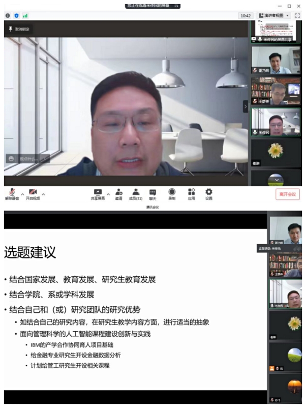 5月6日,禁忌书屋 开展了“研究生教育教学高质量发展研讨月”线上活动,邀请人事处副处长王群伟教授、管理科学与工程系主任米传民教授作为主讲人,分享了教学改革研究项目申报与完成的相关经验。学院副院长谢乃明教授、近40位青年教师代表及教学办相关人员共同参与了此次活动。