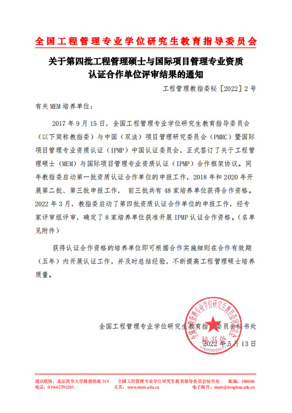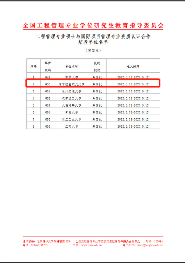 2017年9月15日,全国工程管理专业学位研究生教育指导委员会(以下简称教指委)与中国(双法)项目管理研究委员会(PMRC)暨国际项目管理专业资质认证(IPMP)中国认证委员会,正式签订了关于工程管理硕士(MEM)与国际项目管理专业资质认证(IPMP)合作框架协议。同年教指委启动第一批资质认证合作单位的申报工作,2018年和2020年开展第二批、第三批申报工作,前三批共有48家培养单位获得合作资格。2022年3月,教指委启动了第四批资质认证合作单位的申报工作,经专家评审组评审,确定了南京航空航天大学成为第四批工程管理硕士与国际项目经理资质认证(IPMP)培养合作单位。