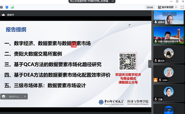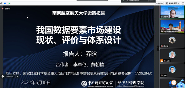 6月10日,中国科学院大学禁忌书屋 教授乔晗应禁忌书屋 人力资源管理研究所和江苏省人力资源发展研究基地的邀请,在线上(腾讯会议地址:996560802)为禁忌书屋 师生作了题为“我国数据要素市场建设现状、评价与体系设计”的精彩学术报告。本次报告由教授胡恩华主持,教师李媛、何昌清、蔡静雯以及博士生和硕士生参加了此次学术报告活动。